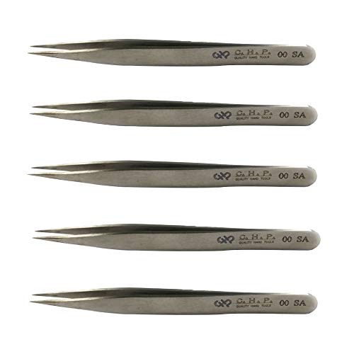 Hakko CHP 00-SA Fine-Tip Tweezers, Straight, Flat Tips, Non-Magnetic Stainless Steel, Corrosion-Resistant, Smooth Grip, 4-1/2" Length (5 Pack)