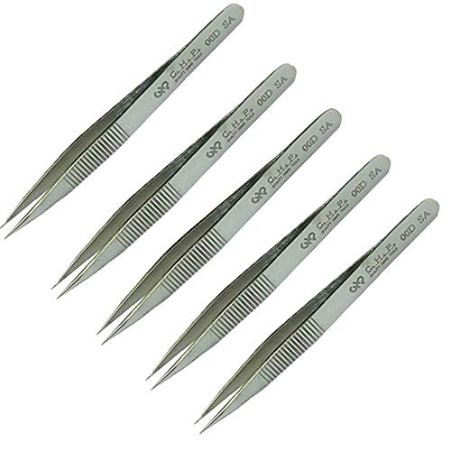 Hakko CHP 00D-SA Fine-Tip Tweezers, Straight, Serrated Fine-Point Tips, Non-Magnetic Stainless Steel, Corrosion-Resistant, Serrated Grip, 4-1/2" Length (5 Pack)